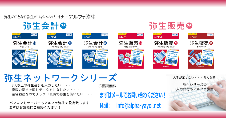 | 弥生製品購入ご検討中のお客様向け無料体験セミナー開催! 詳細はこちらから ※個別相談会もご予約お受けしております。個別相談会詳細はこちらから 弥生会計・弥生販売(デスクトップソフト)使い方セミナー毎月開催(東京・大阪) 2025年12月・2026年1月・2月・3月・4月・5月 日程更新しました。 アルファ弥生のセミナー受講後のご質問は、ブログ「弥生でGo!」でお受けしております。 |